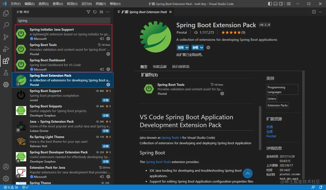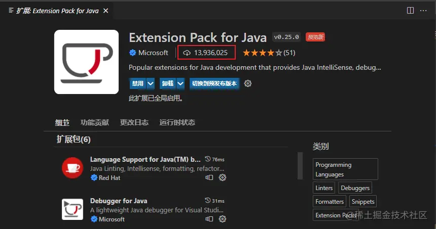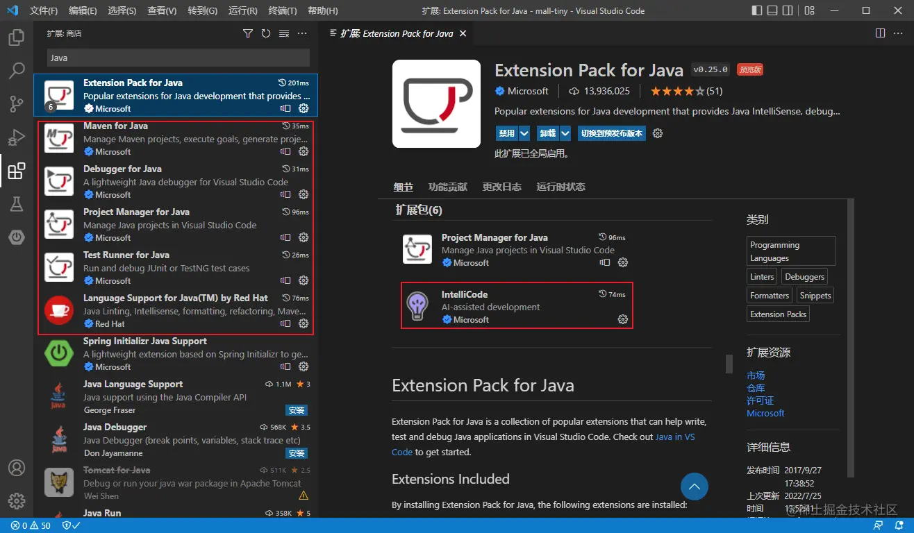 Extension Pack for Java,此插件包含6个基本的Java扩展插件,可以满足我们开发Java程序的基本需求;