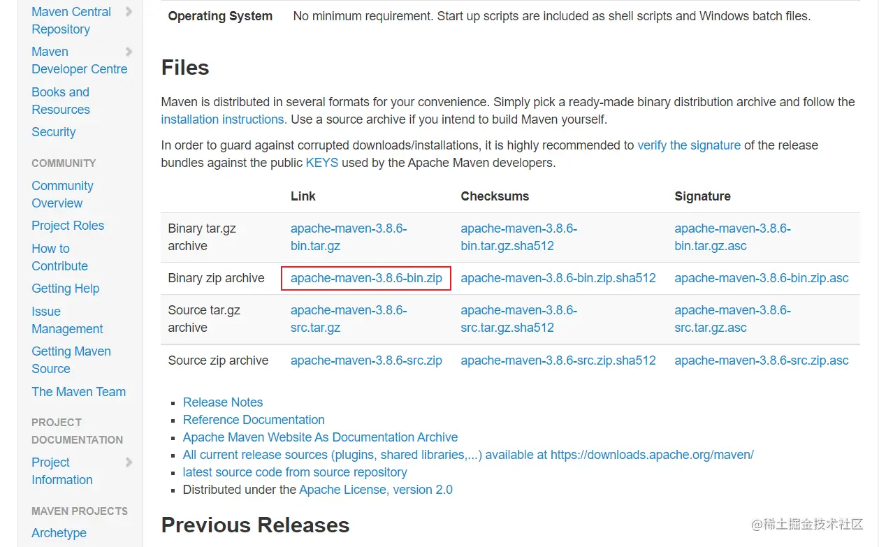 - 由于VSCode只是个开发工具,它不会像IDEA那样直接集成Maven,这里我们需要安装好Maven并配置环境变量,首先下载Maven的安装包,下载地址:maven.apache.org/download.cg…