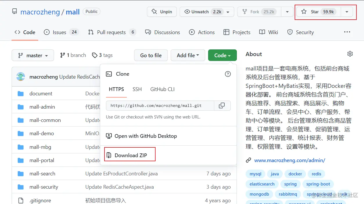 - 接下来导入mall项目的代码,下载地址:github.com/macrozheng/…