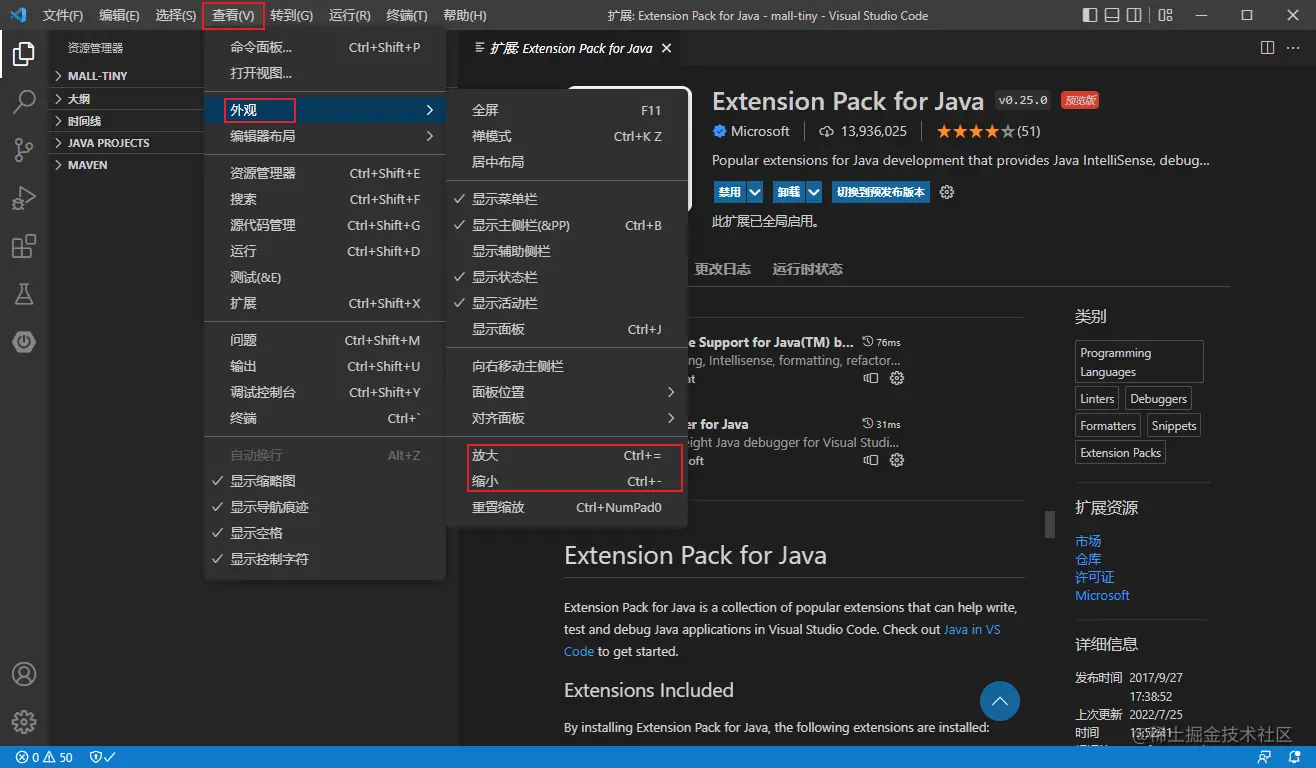 在使用代码编辑器之前,很多朋友都会有配置字体大小的习惯,VSCode配置字体大小的方式十分简单,直接在外观设置中点击放大或缩小按钮即可。