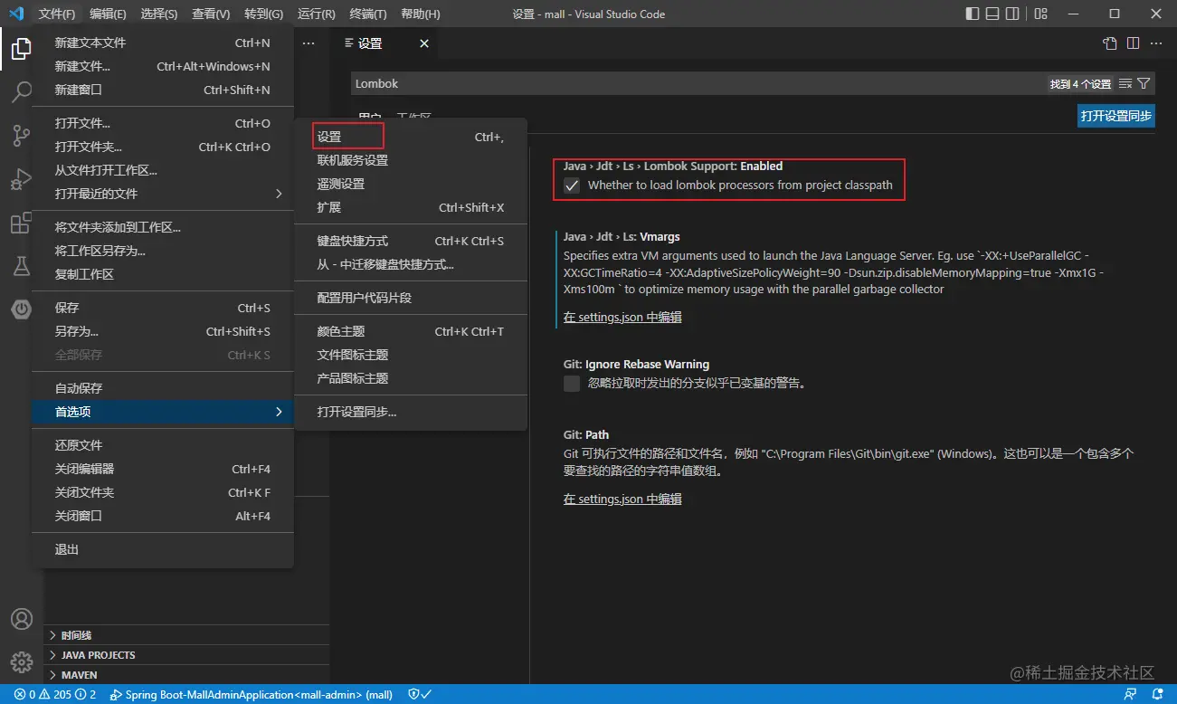 - 本想再安装下Lombok插件,后来发现VSCode已经内置了Lombok支持,可以在设置中进行开启,安装完这些插件后就可以开始开发Java程序了。
