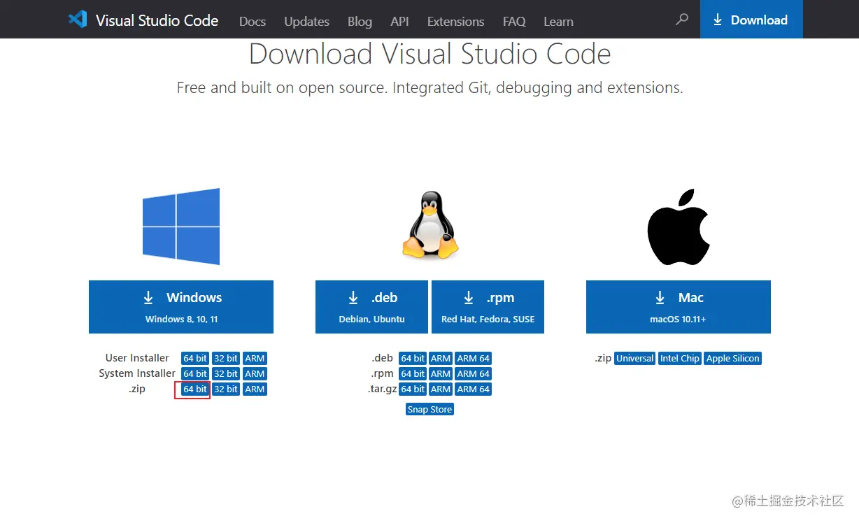 - 首先我们需要下载VSCode的安装包,下载压缩包版本简单又快捷,下载地址:code.visualstudio.com/Download