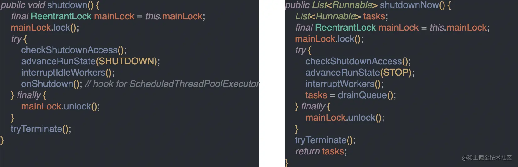 - tryTerminate():Transitions to TERMINATED state if either (SHUTDOWN and pool and queue empty) or (STOP and pool empty)