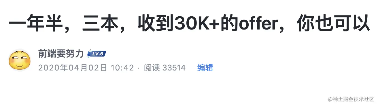 18年9月中旬,出来面试,背完两本面试宝典!一天当场拿到两个offer,一个16k,一个17k,然后直接入职了;依稀的记得,那天下午面完试,我下了公司的楼,然后去小店买了包软中,蹲在路边抽,百感交集!10月底拿到19koffer,心虚没敢去!以前行情好,简历上不写项目都可以拿到offer,只要会吹,然后拿到了有生以来第一个学习上的第一名,某马上海前端25期,第一个找到工作的,也是工资最高的,5月中旬到9月18号找到工作,历时4个月!