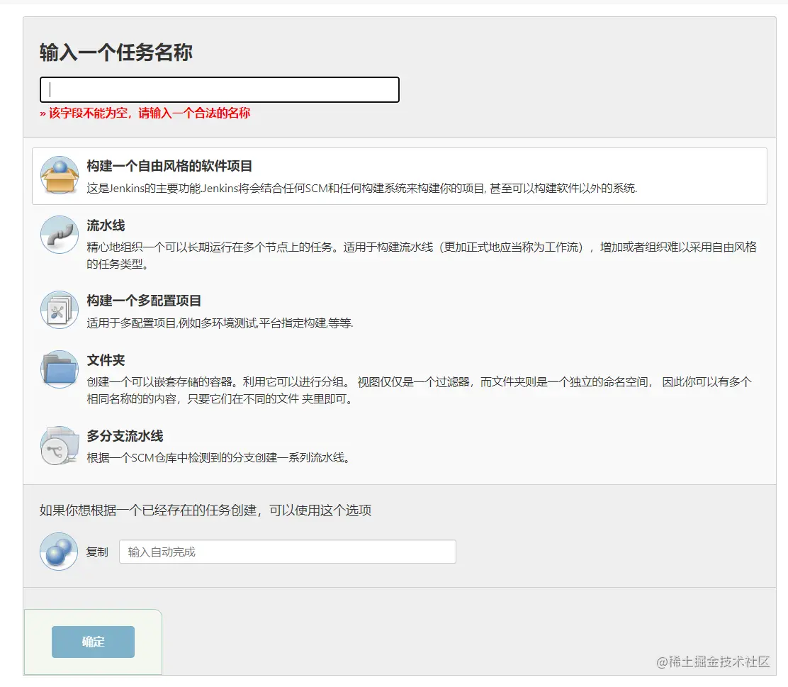 根据实际用途选择类型,这里选择第一个“构建一个自由风格的软件项目”;输入名称点击确定按钮创建空的一个构建任务。