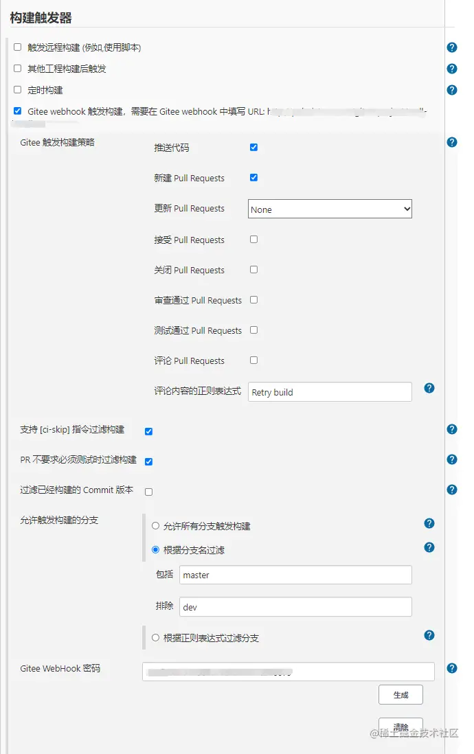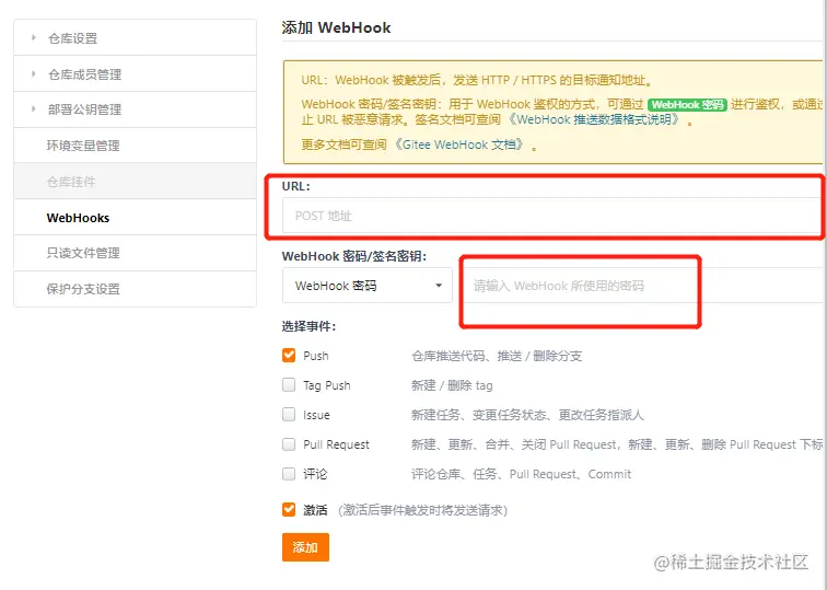 需要在上面第二步中提示的 Url 和 Gitee WebHook 密码 同时配置到仓库当中。