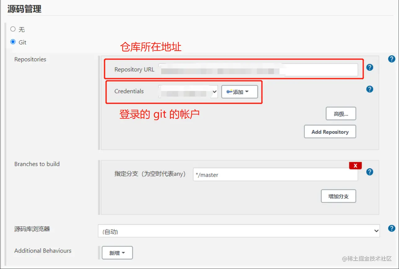 打开刚创建的任务,选择配置,添加远程仓库地址,配置登录名及密码及分支。