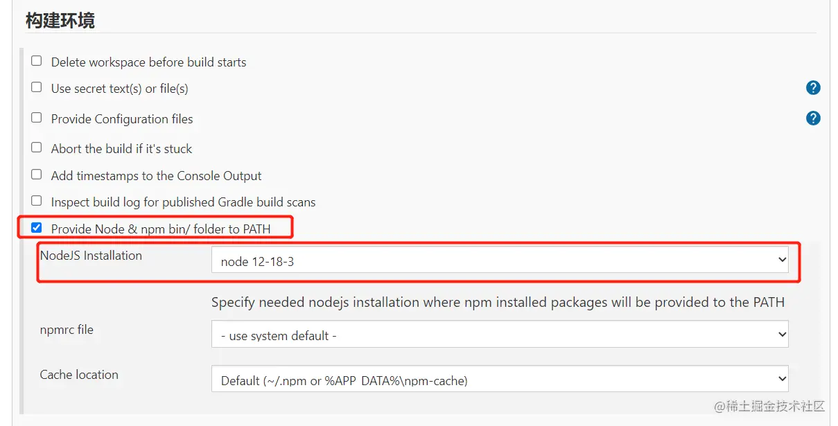 打开刚刚的 Jenkins 任务,点击配置里面的构建环境,勾选图中红色方框的这个选项,并指定一个 node 版本。