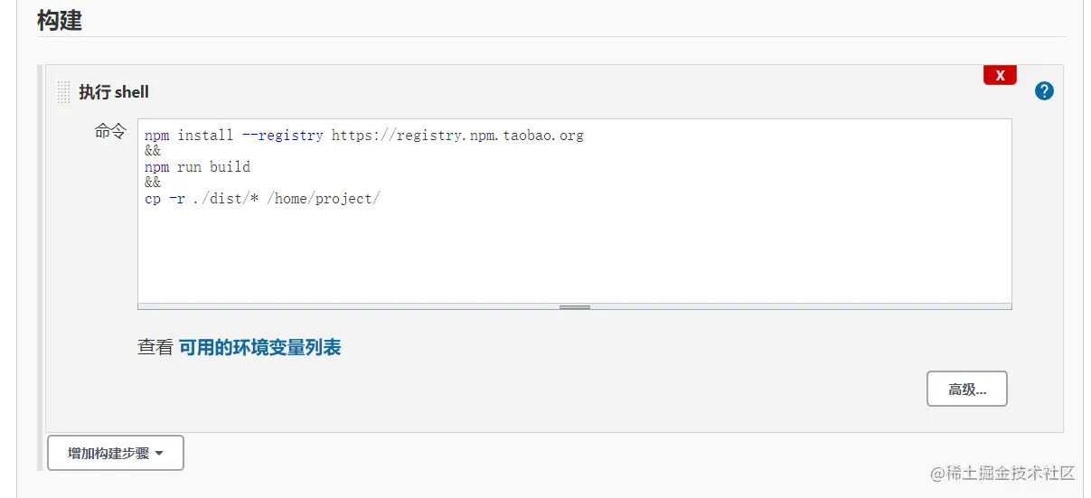 点击构建,选择 “执行 shell” 选项,把要执行的 shell 脚本命令输进去,多个命令使用 && 分开;