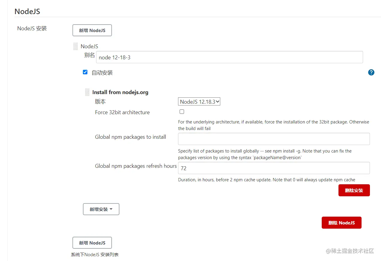 配置构建的环境需要先配置 Jenkins 所含有的 node 环境;需要进入(系统管理-全局工具设置- NodeJS 安装)进行所需的 node 版本。