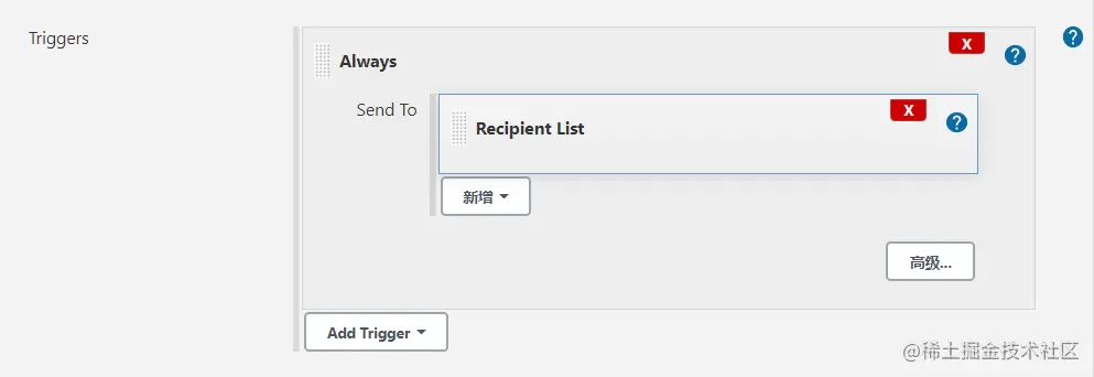 - 然后点击 Advanced Settings-Triggers-Add Trigger(即上图的右下角的“Advanced Settings...”按钮),选择always,意思是无论什么情况任务执行完就发邮件,也可以选择其他模式,如任务执行异常了才发邮件。