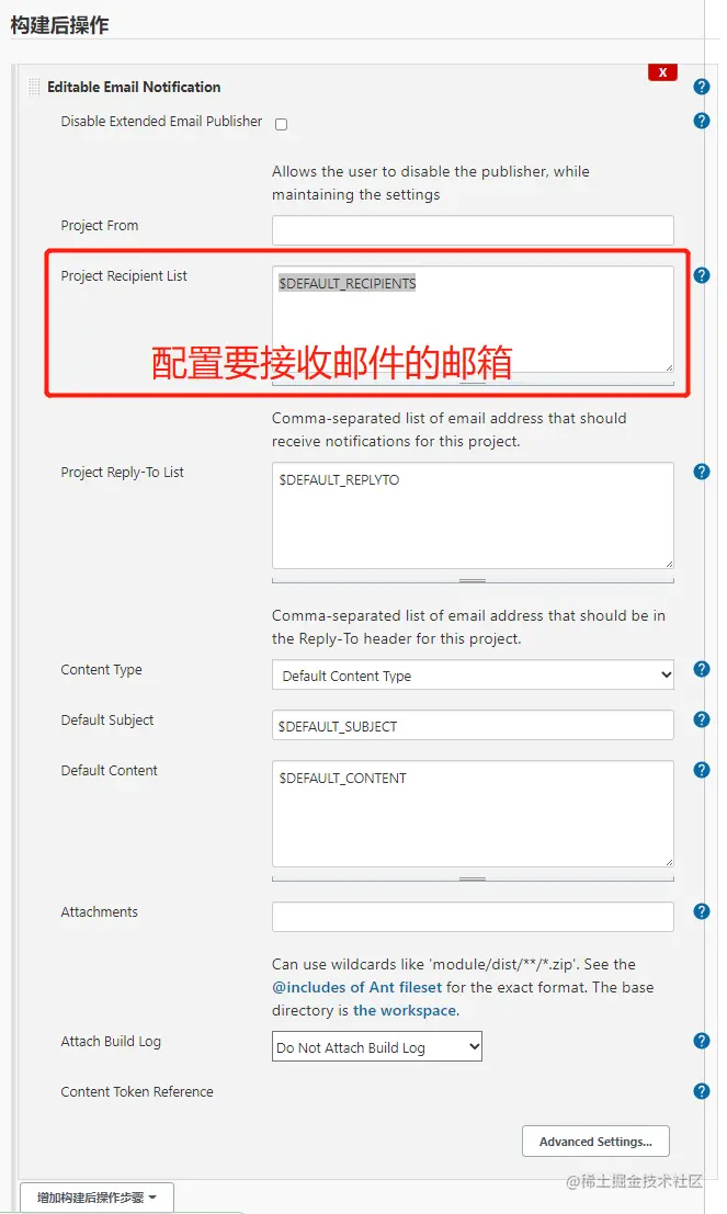 - 打开创建的那个任务,增加构建后操作步骤选择 Editable Email Notification,Project Recipient List那里写你要发给谁邮件,可以多个,用分号隔开。