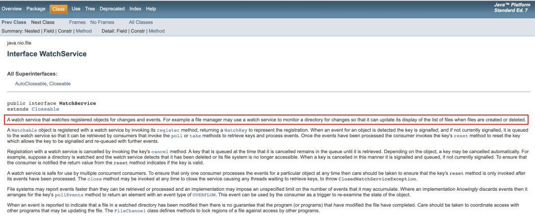 当了解到之前的实现存在BUG后,我就去搜了一下Java下如何监听文件变更,果然被我找到了WatchService。