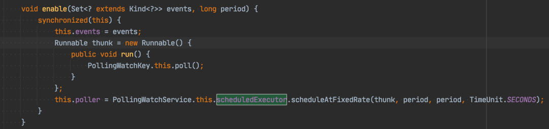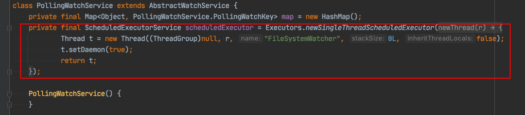 PollingWatchService上来就起了个线程,这让我隐隐不安。再找一下这个scheduledExecutor在哪里用到: