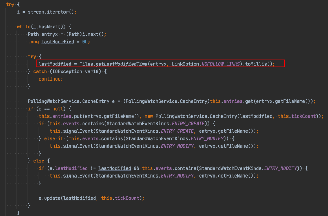 果然,和我们的实现类似,也是去读文件的最后更新时间,根据时间的变化来发出变更事件。