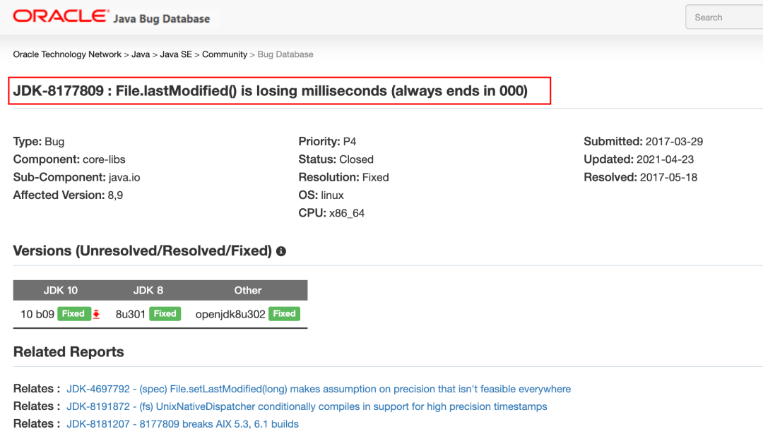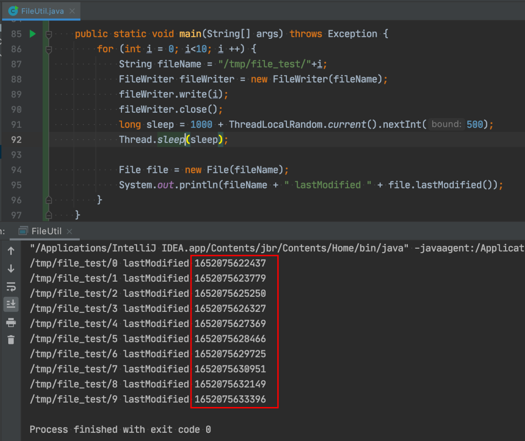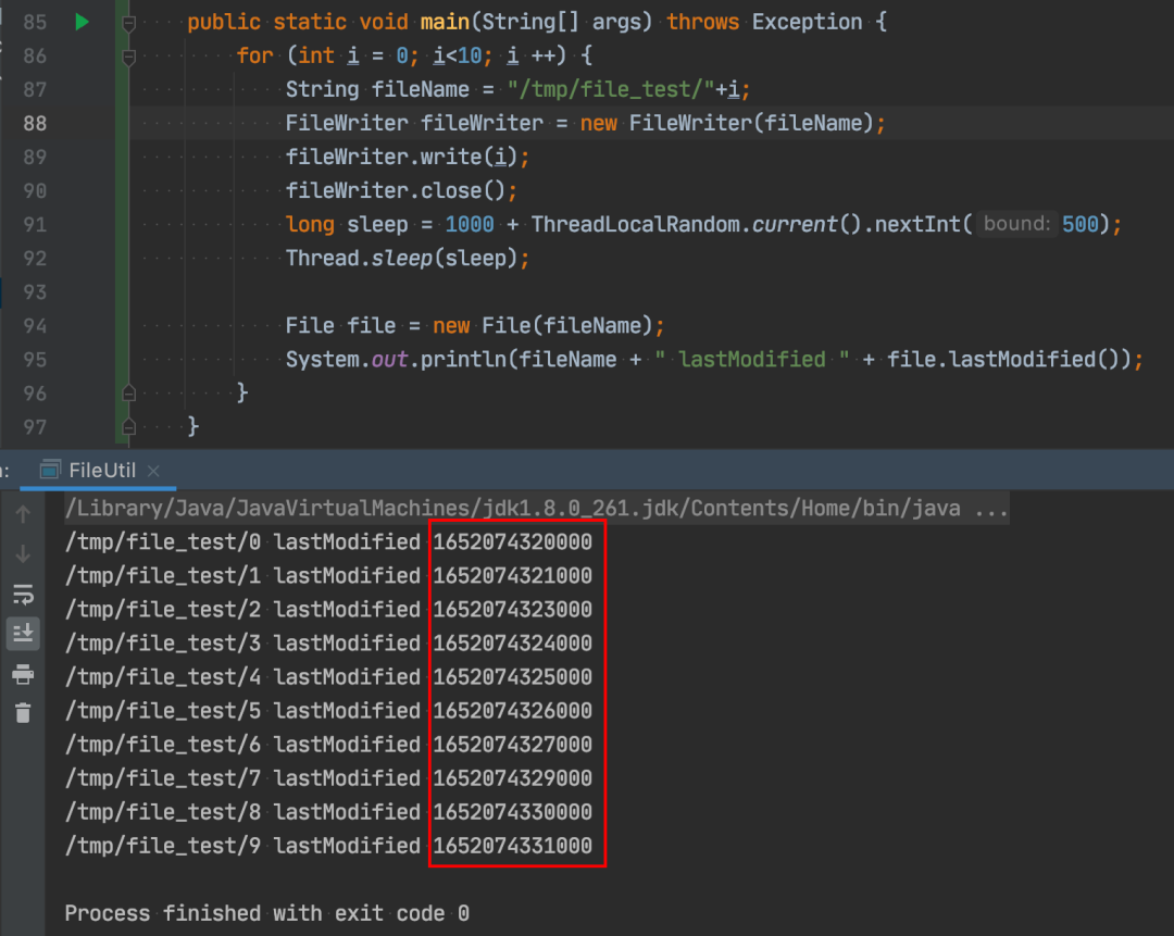 在某些JDK版本下,获取文件的最后更新时间戳会丢失毫秒精度,总是返回整秒的时间戳,为了直观感受,写了个demo分别在jdk1.8.0_261和jdk_11.0.6测试(均为MacOs):