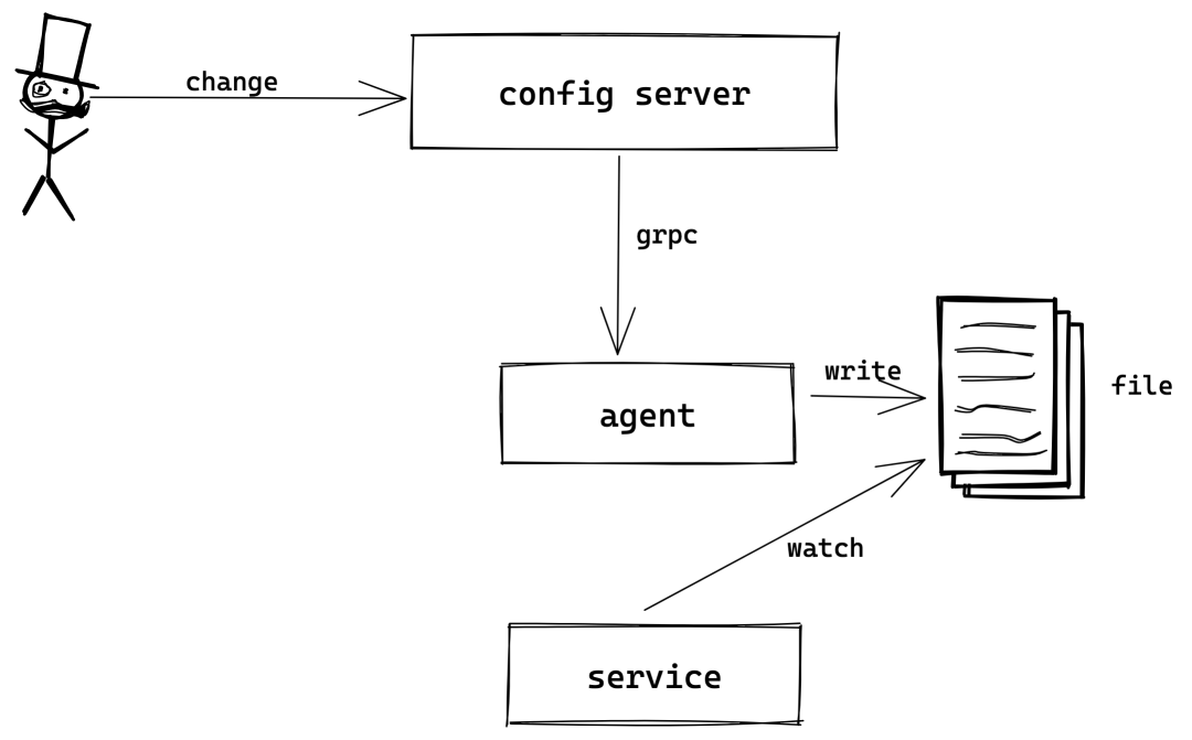 有一个下发配置的服务,这个配置服务的实现有点特殊,服务端下发配置到各个服务的本地文件,当然中间经过了一个agent,如果没有agent也就无法写本地文件,然后由client端的程序监听这个配置文件,一旦文件有变更,就重新加载配置,画个架构图大概是这样: