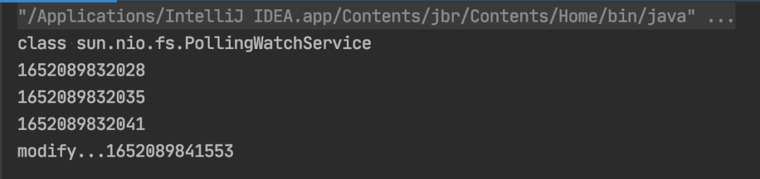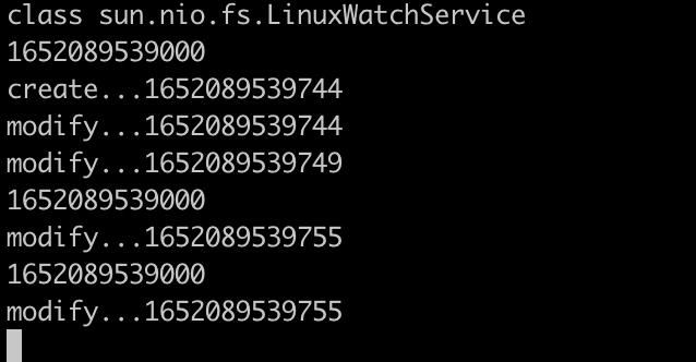 先对/tmp/file_test目录进行监听,然后每隔5毫秒往文件写数据,理论上来说,应该能收到3次事件,但实际上很奇怪,仔细看接收到modify事件的时间大概是第一次文件修改后的9.5s左右,很奇怪,先记着,我们读一下WatchService源码