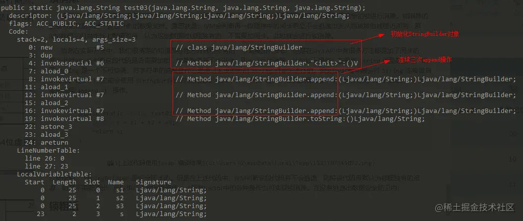 当然在实际开发中,我们很清楚的知道哪些是线程独有的,不需要加同步锁,但是在Java API中有很多方法都是加了同步的,那么此时JVM会判断这段代码是否需要加锁。如果数据并不会逃逸,则会进行锁消除。比如如下操作:在操作String类型数据时,由于String是一个不可变类,对字符串的连接操作总是通过生成的新的String对象来进行的。因此Javac编译器会对String连接做自动优化。在JDK 1.5之前会使用StringBuffer对象的连续append()操作,在JDK 1.5及以后的版本中,会转化为StringBuidler对象的连续append()操作。