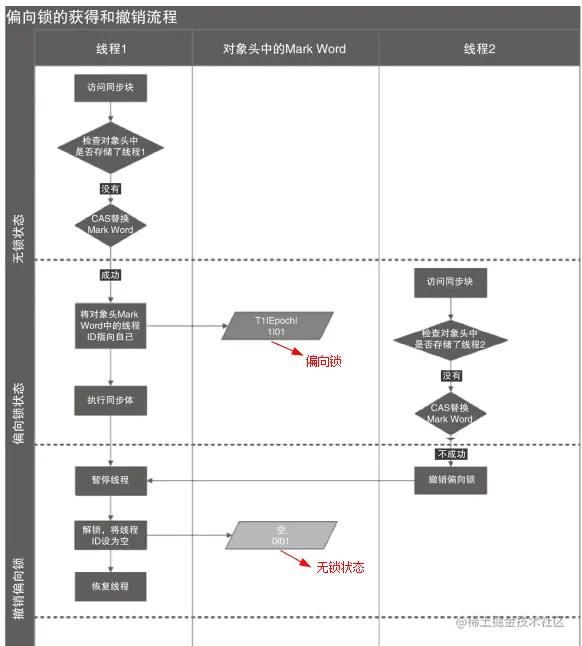 为了解决这一问题,HotSpot的作者在Java SE 1.6 中对Synchronized进行了优化,引入了偏向锁。当一个线程访问同步块并获取锁时,会在对象头和栈帧中的锁记录里存储锁偏向的线程ID,以后该线程在进入和推出同步块时不需要进行CAS操作来加锁和解锁。只需要简单的测试一下对象头的Mark Word里是否存储着指向当前线程的偏向锁。如果成功,表示线程已经获取到了锁。