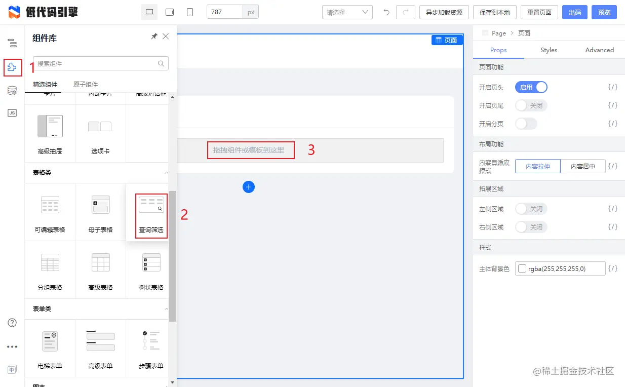 组件库中选择查询筛选组件,通过拖拽的形式插入编辑区中;