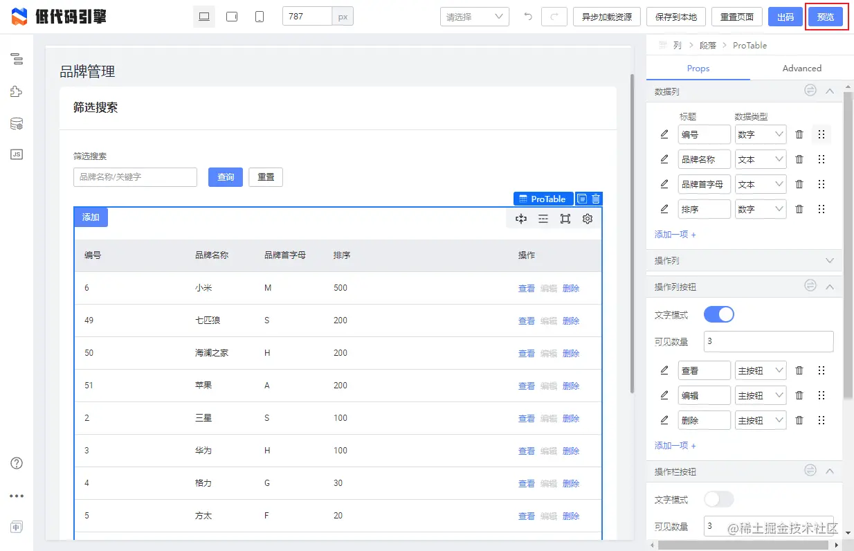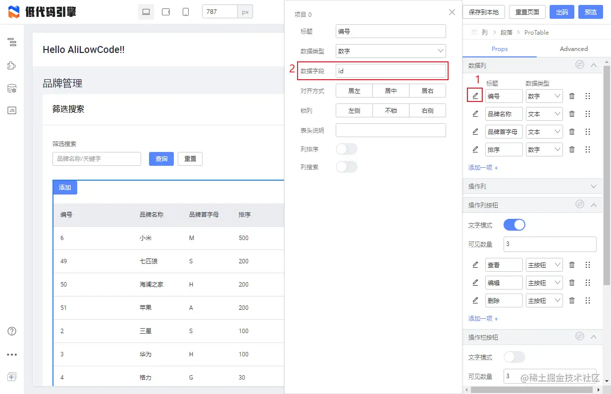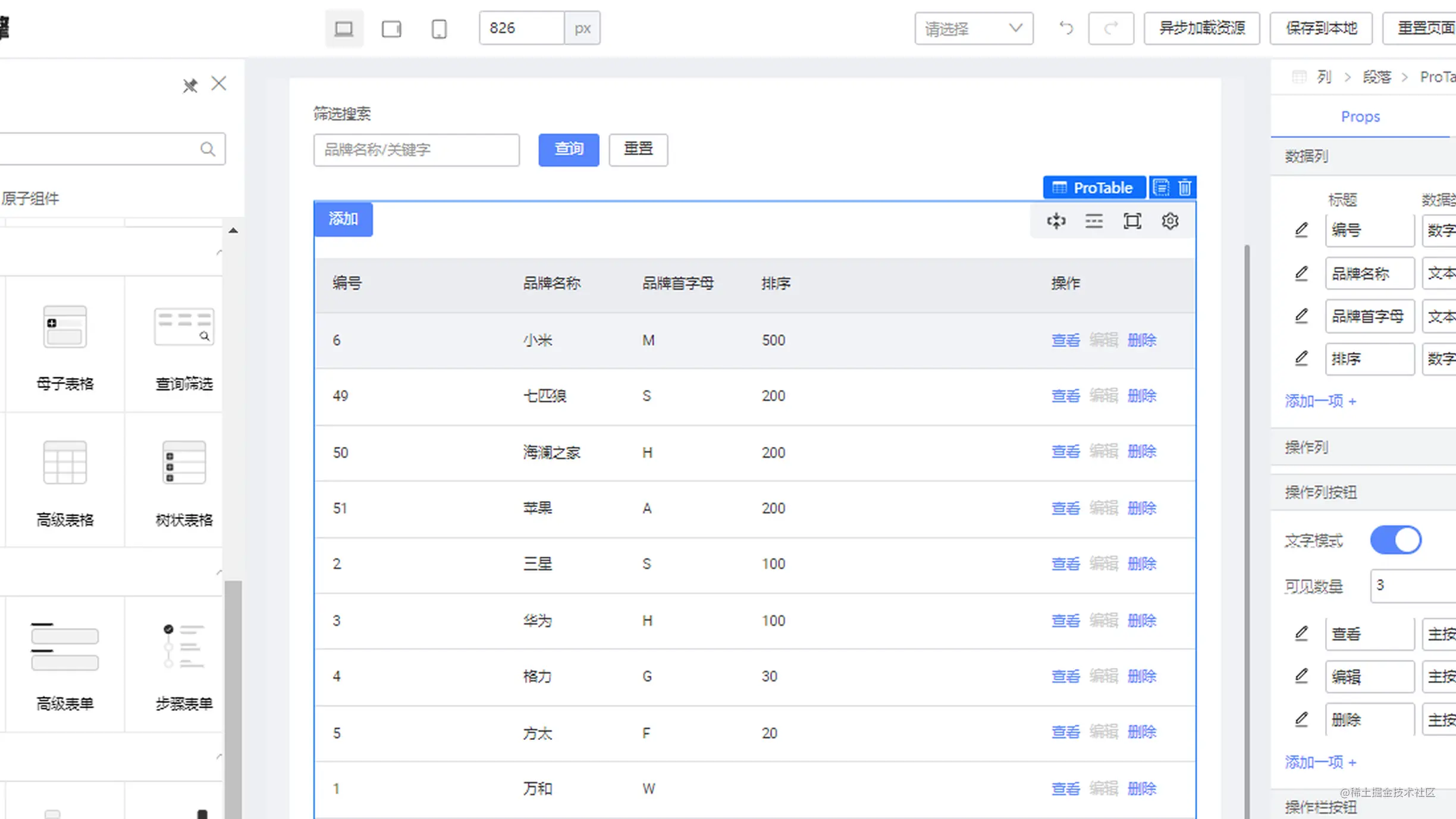 高级表格组件可以对表格进行设置,我们可以通过数据列来设置需要显示的数据。