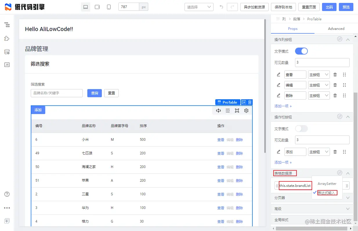 高级表格组件,修改表格数据源,选择表达式输入,填入我们之前设置的数据源ID即可;