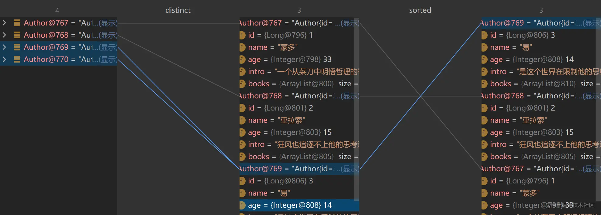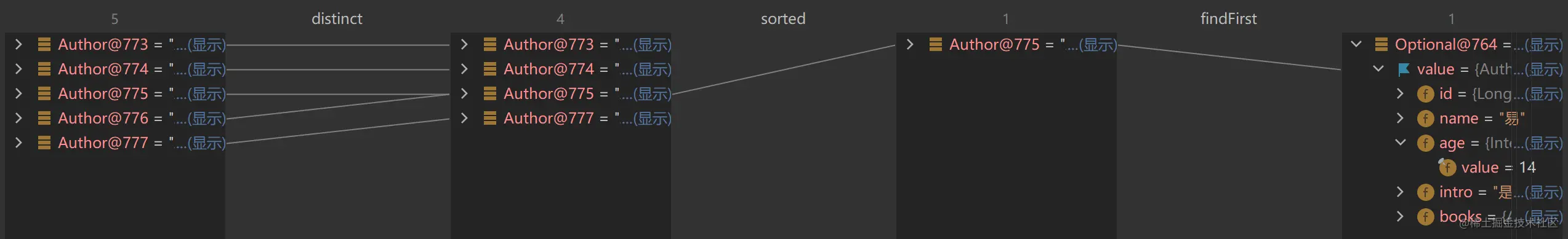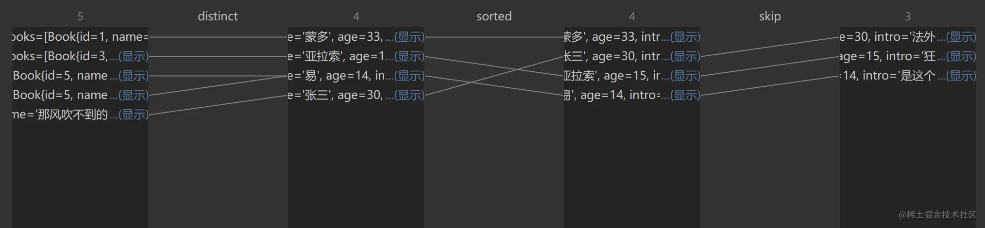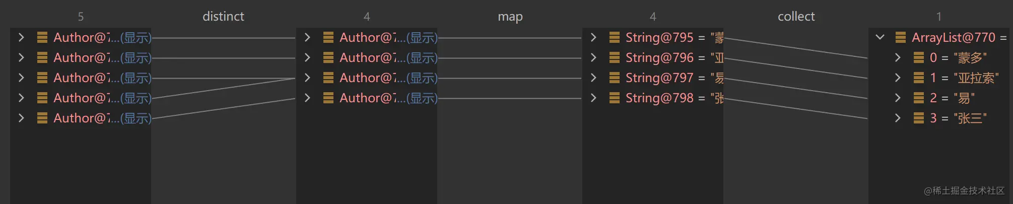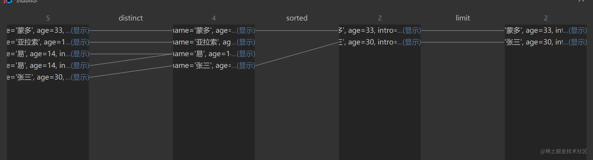 假如我们对该作家列表进行操作,要求对作家列表进行去重,并过滤年龄小于18的作家,然后依次打印作者姓名和年龄。