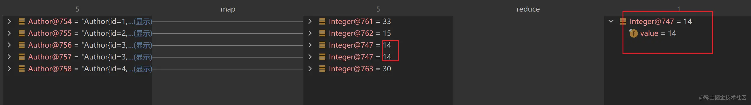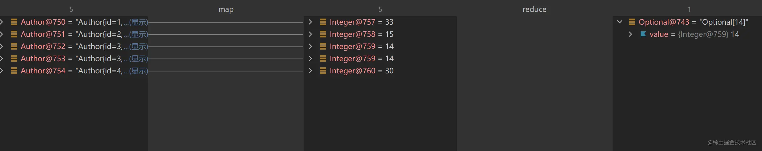 reduce 的作用就是把 stream 流中的元素组合起来,我们可以传入一个初始值,它会按照我们的计算方式依次拿流中的元素和初始值进行计算后返回结果,结果再和后面的元素计算(累加)。