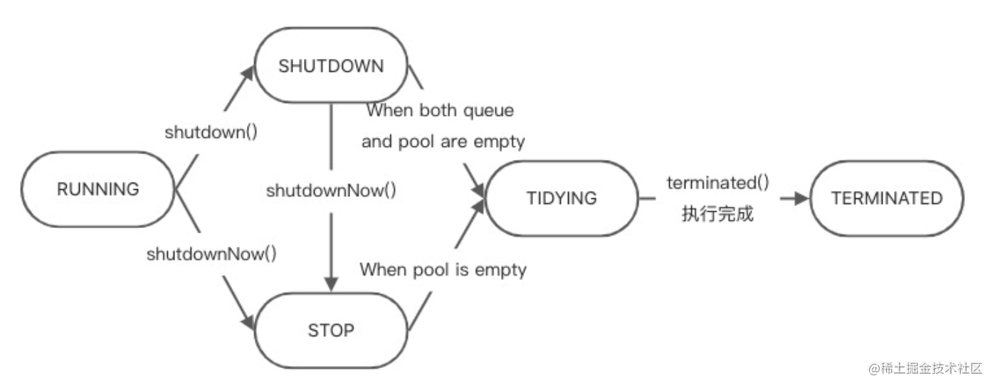 RUNNING:运行状态,接受新任务,持续处理任务队列里的任务;SHUTDOWN:不再接受新任务,但要处理任务队列里的任务;STOP:不再接受新任务,不再处理任务队列里的任务,中断正在进行中的任务;TIDYING:表示线程池正在停止运作,中止所有任务,销毁所有工作线程,当线程池执行terminated()方法时进入TIDYING状态;TERMINATED:表示线程池已停止运作,所有工作线程已被销毁,所有任务已被清空或执行完毕,terminated()方法执行完成;