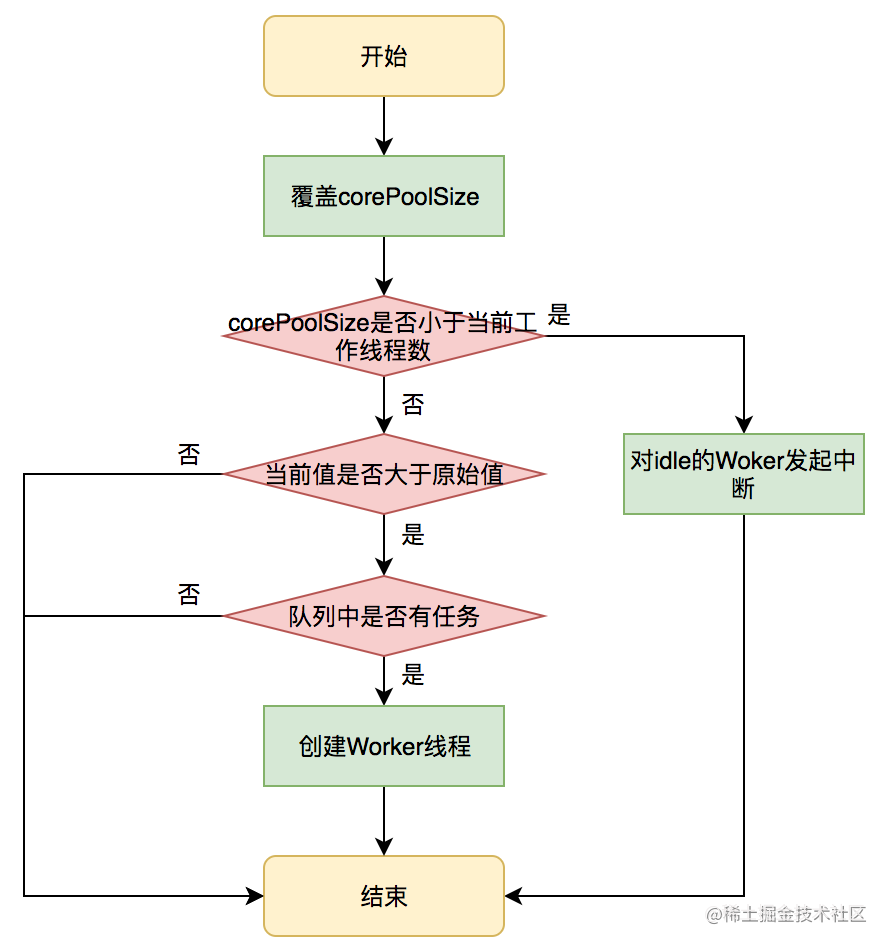 setMaximumPoolSize() 可用于调整最大线程数,其流程如下