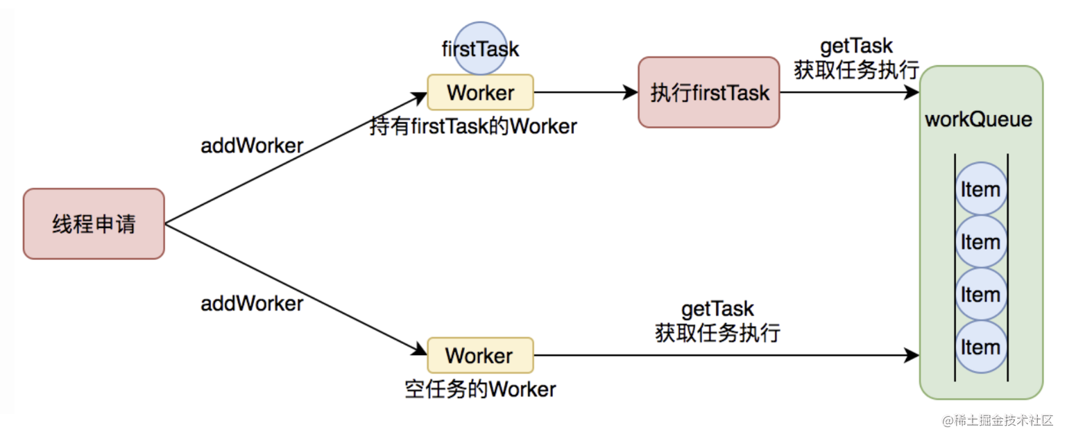 - 创建新的工作线程 worker,然后工作线程数进行加一操作,运行创建的工作线程 worker,开始获取任务 task。