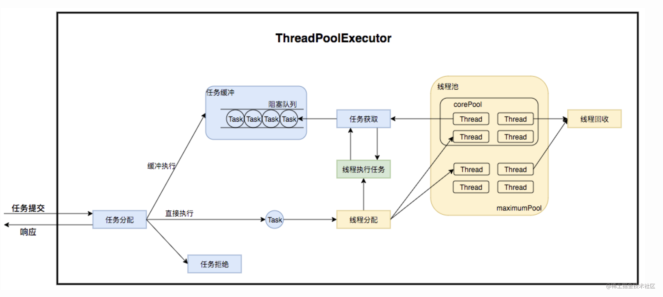 corePoolSize,新提交的任务会被尝试放进任务队列workQueue中等待执行; - 当线程池里面存活的线程数已经等于