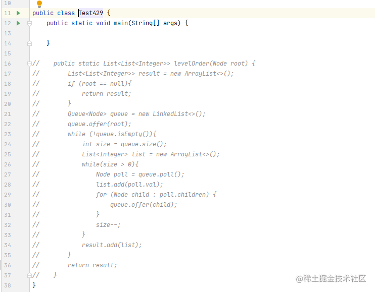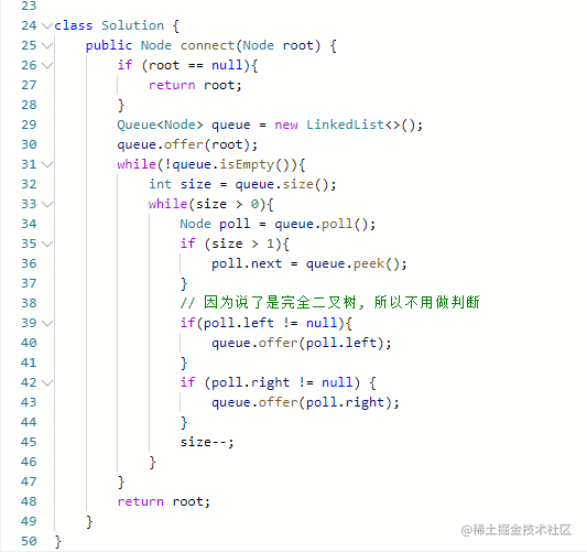 - 但是需要注意的是最后一个节点指向 null, 所以判断条件为 size > 1 , 因为我们 size--, size == 1代表当前节点是该层节点的最后一个节点