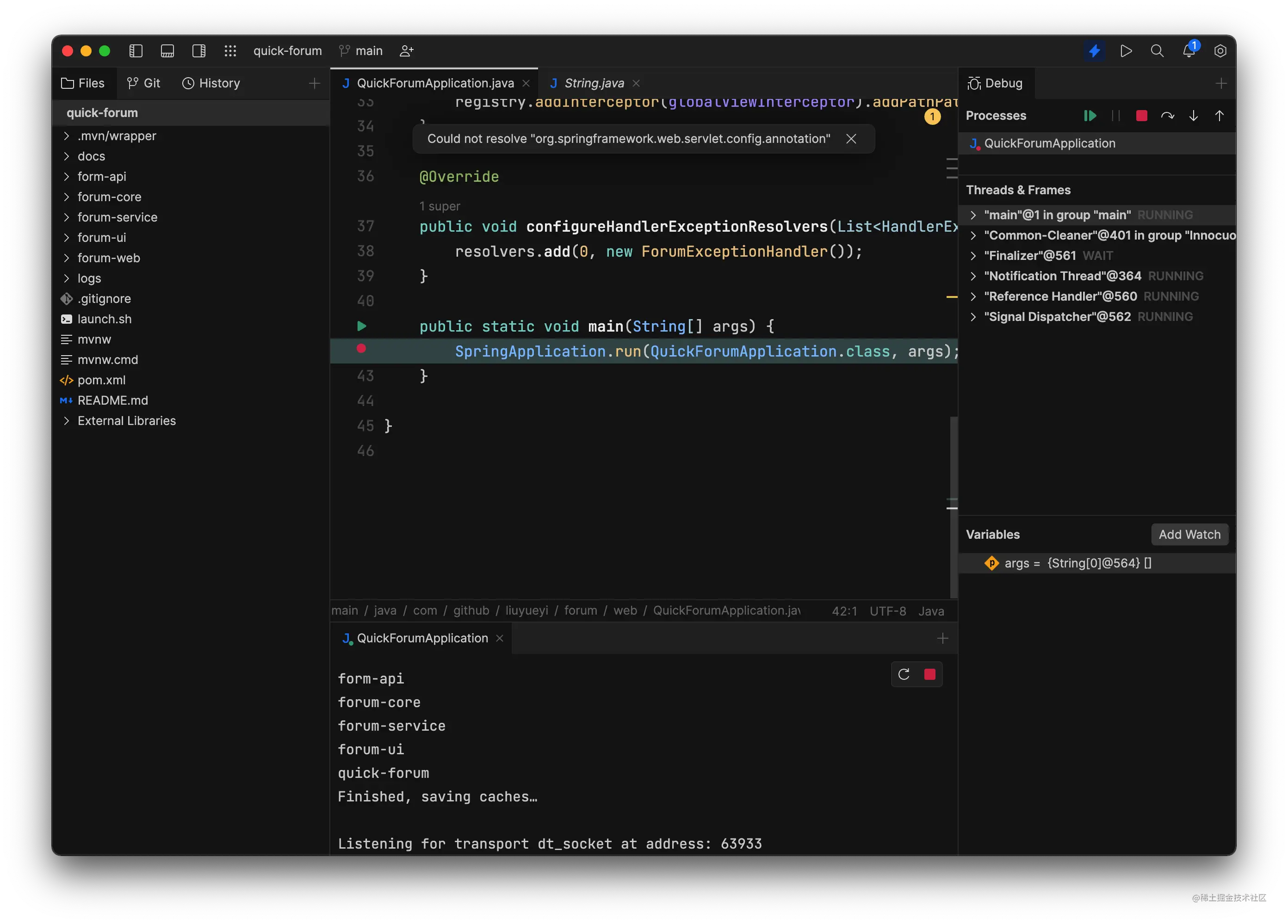 OK,打开一个我们四剑客团队正在研发的一个新项目。整个打开的过程还是非常快的,比起 Intellij IDEA,确实要快很多很多很多很多。