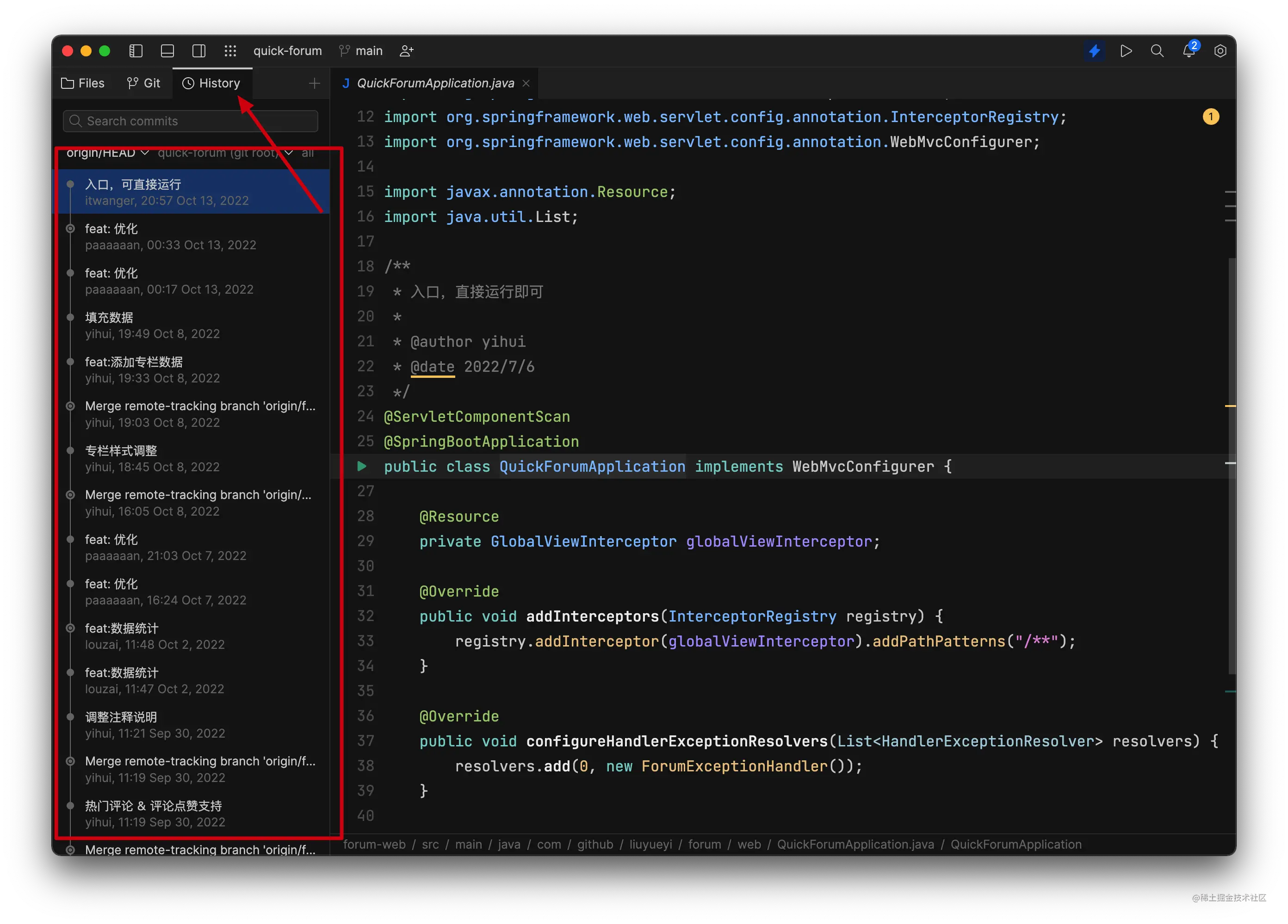 感觉比 Intellij IDEA 便捷,有没有?点击「history」面板还可以查看版本历史。