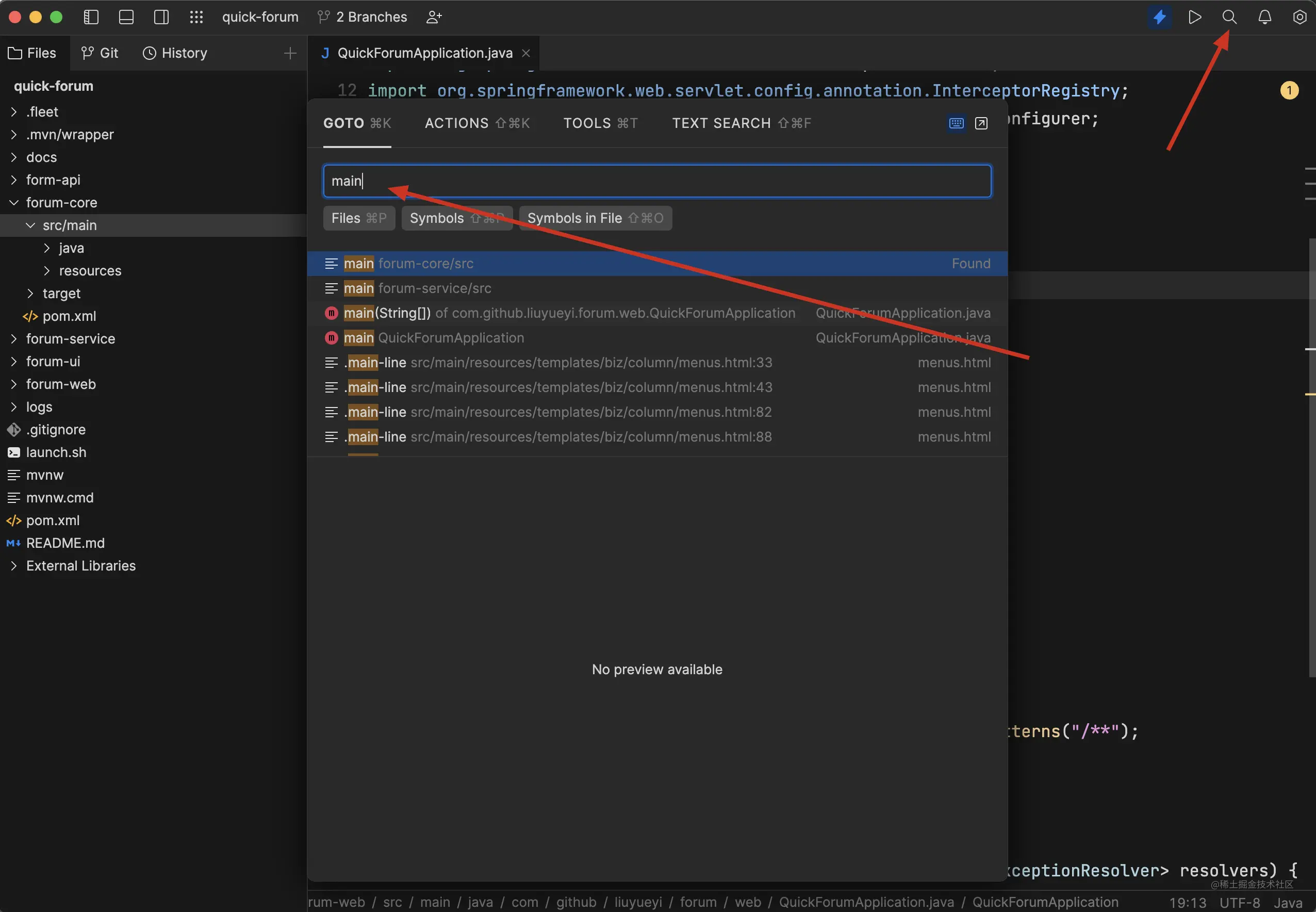 Fleet 提供了多种搜索和导航工作区的方法,允许我们快速查找文件、文件中的位置等等。只需要点击右上角的搜索🔍图标就可以打开了。
