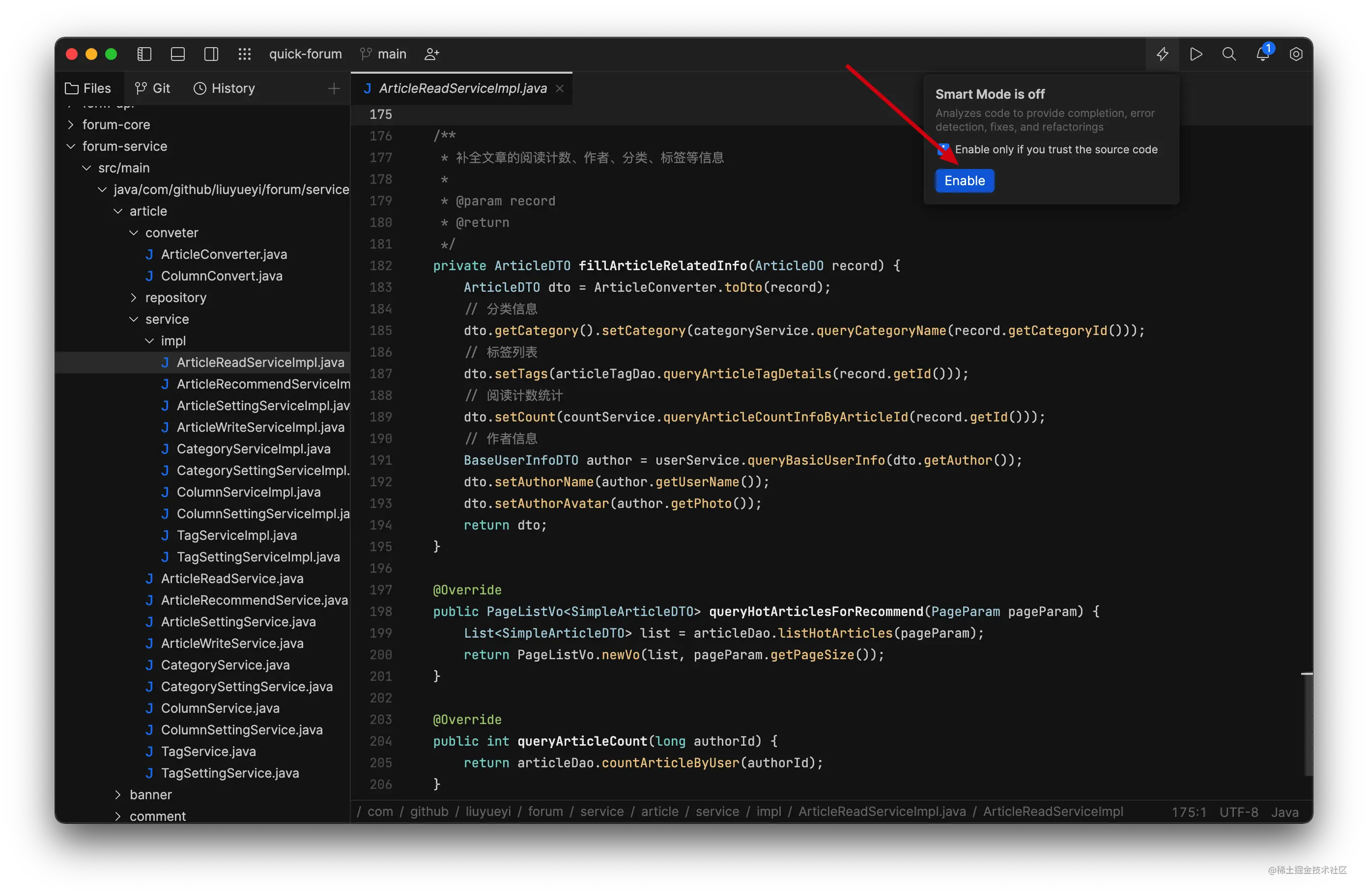 开启智能化模式后,Fleet 就具备了智能补全、重构、导航、调试、实时代码质量检查、快速修复的所有功能,如果只是普通的文本编辑,则可以一键关闭智能化模式。