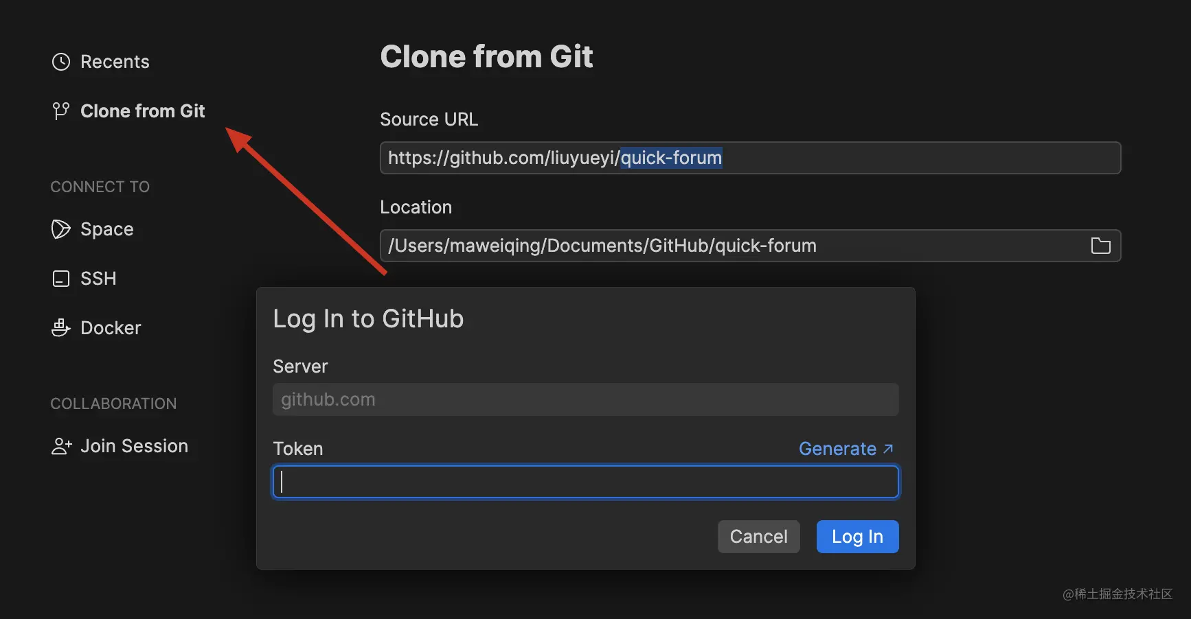 挺人性化的,提供了 Git、SSH、Docer 等链接方式。但不得不吐槽的事,Git 的方式还不够流畅,需要先去 generate 一个 token 才行。