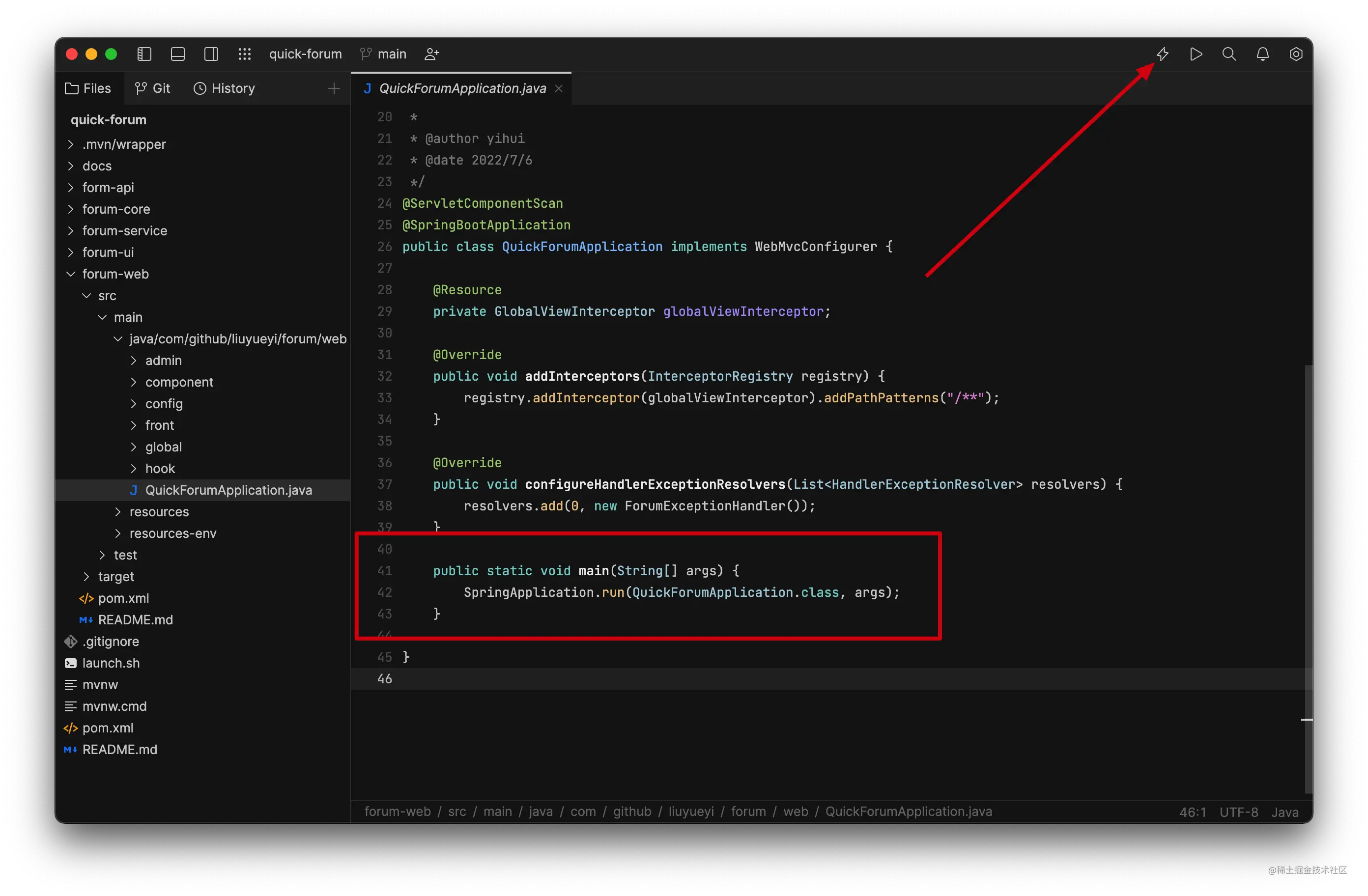 当然了,如果你没有启动智能化模式,只需要轻点右上角的「闪电」小图标就 OK 了。否则,主类会没有可运行按钮。