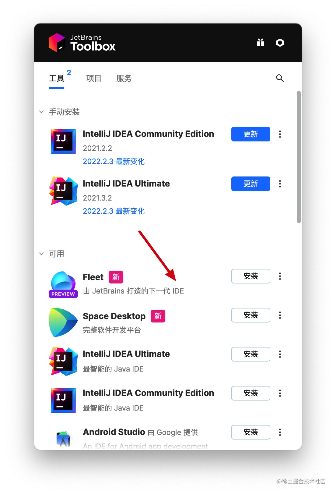 没啥好说的,直接下载安装就 OK 了。接着启动 Toolbox,就可以看到 Fleet 了。说实话,这个 Toolbox 感觉还真的挺不错的,里面把我之前安装的 Intellij IDEA 社区版和旗舰版都显示出来了,并且提示我要更新(可我是有私心的,旗舰版肯定是不会更新的😂)。