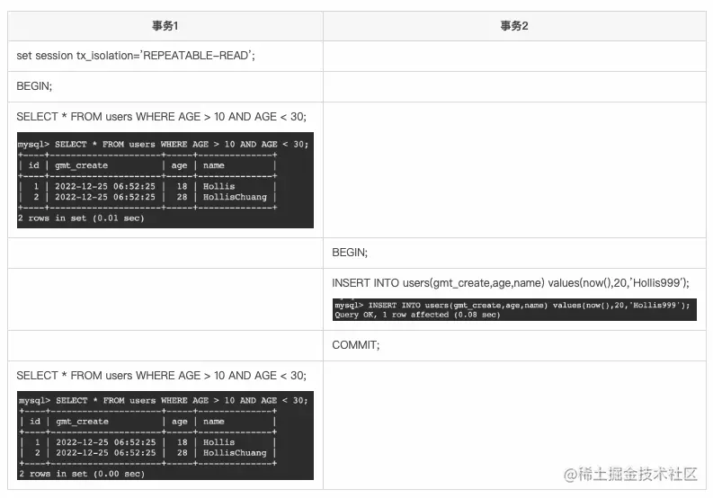 在上面的例子中,在事务1中,我们并没有在事务开启后立即加锁,而是进行了一次普通的查询,然后事务2插入数据成功之后,再通过事务1进行了2次查询。