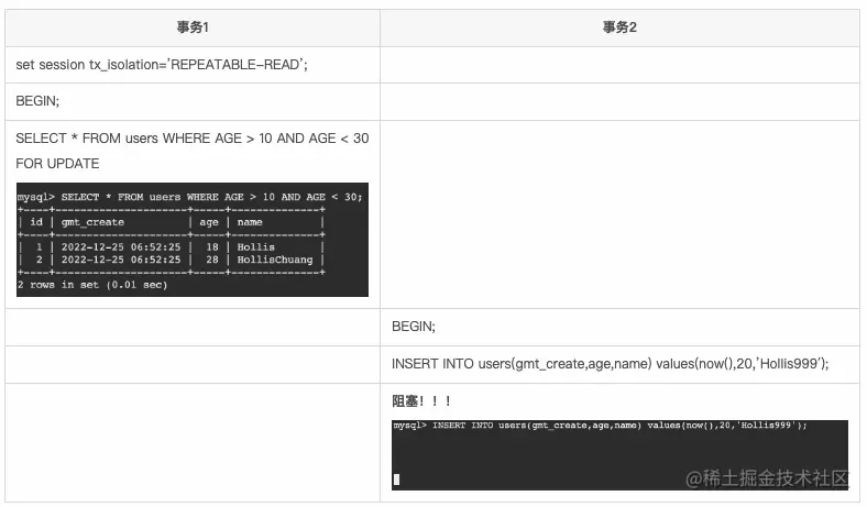 像上面这种情况,在RR的级别下,当我们使用SELECT … FOR UPDATE的时候,会进行加锁,不仅仅会对行记录进行加锁,还会对记录之间的间隙进行加锁,这就叫做间隙锁(参考:数据库的锁,到底锁的是什么?)。因为记录之间的间隙被锁住了,所以事务2的插入操作就被阻塞了,一直到事务1把锁释放掉他才能执行成功。