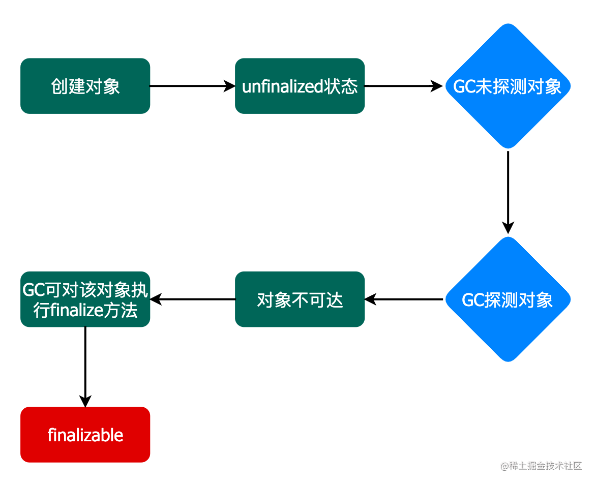 大致描述一下finalize的运行流程:当对象变成(GC Roots)不可达时,GC会判断该对象是否覆盖了finalize方法,若未覆盖,则直接将其回收。
