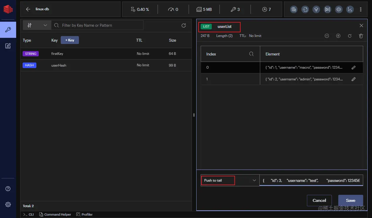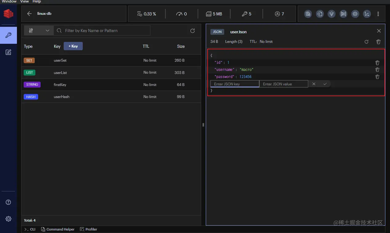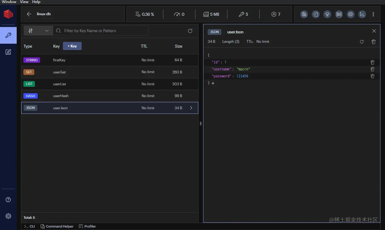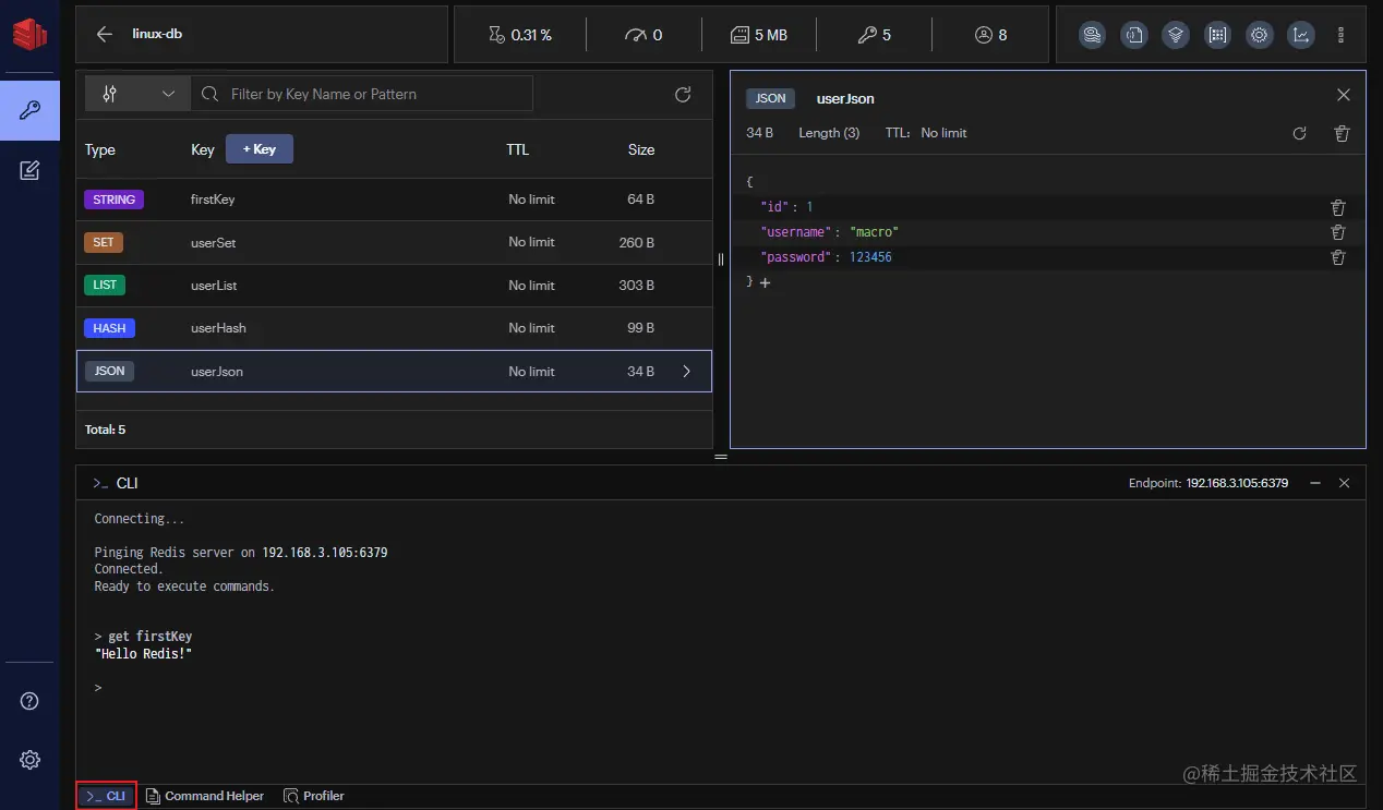 RedisInsight是Redis官方出品的可视化管理工具,可用于设计、开发、优化你的Redis应用。支持深色和浅色两种主题,界面非常炫酷!可支持String、Hash、Set、List、JSON等多种数据类型的管理,同时支持远程使用CLI功能,功能非常强大!
