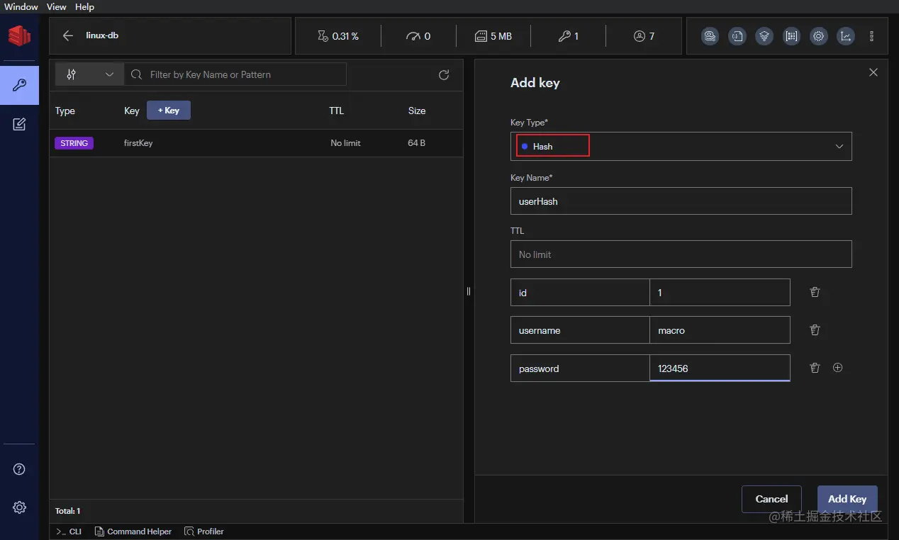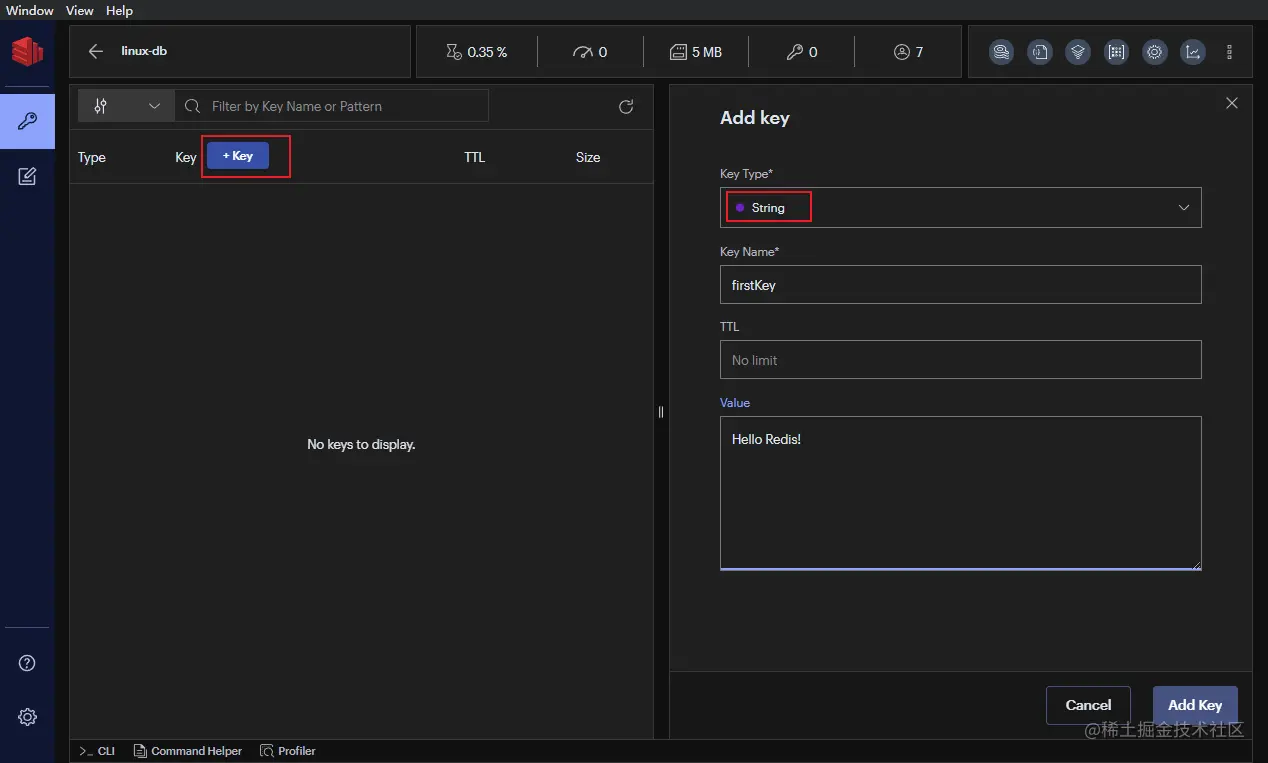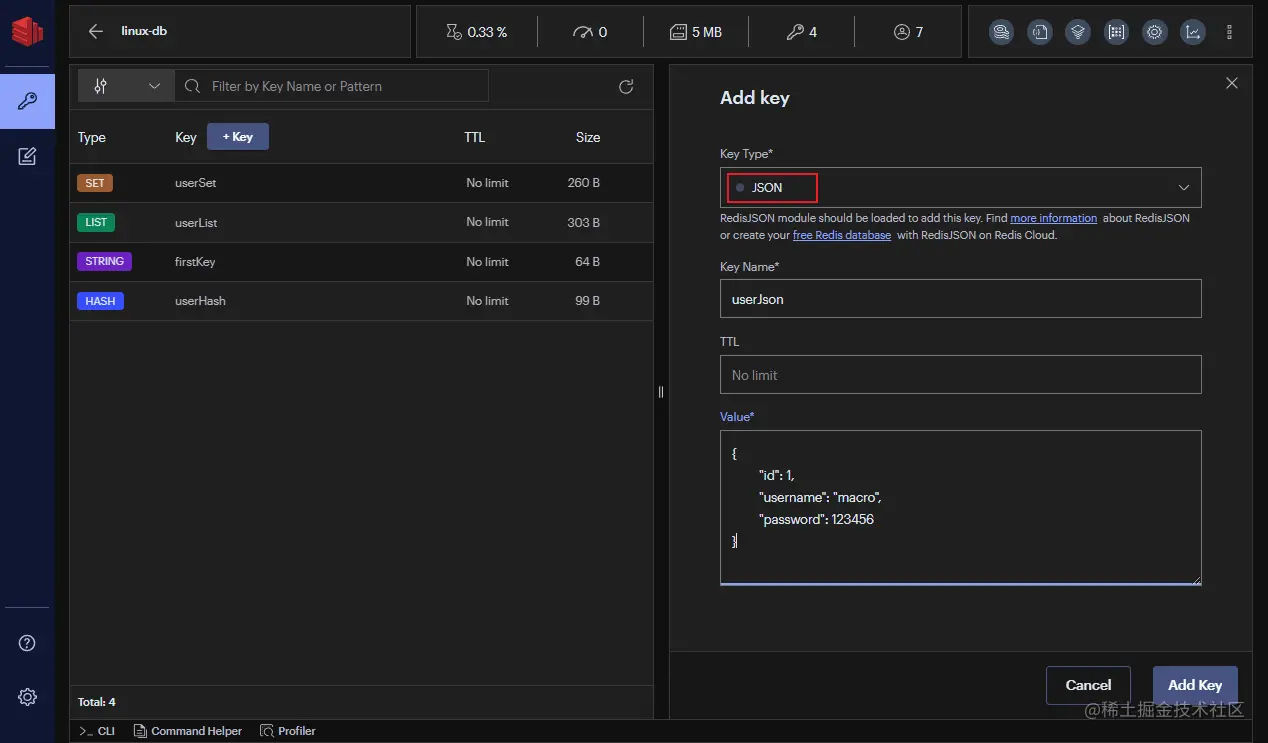 - 接下来我们就可以通过RedisInsight在Redis中添加键值对数据了,比如添加