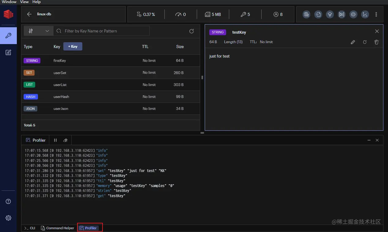 通过Profiler功能,我们可以查看Redis的命令执行日志,比如我们使用RedisInsight添加一个叫testKey的键值对,Profiler将显示如下日志。
