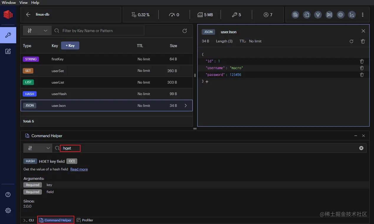 Command Helper这个查找命令文档的功能,比如我们可以搜索下hget这个命令的用法。