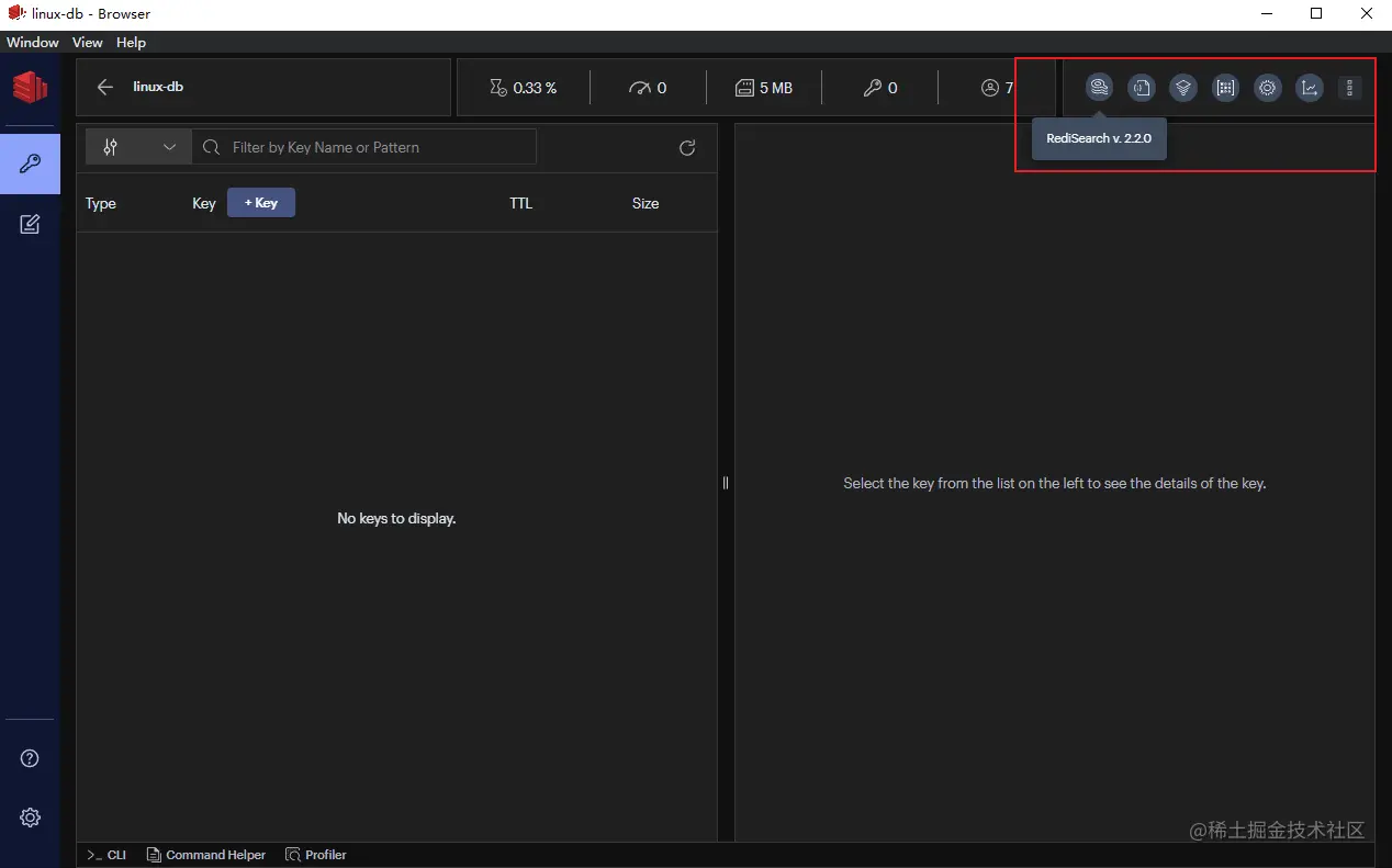 - 打开连接后即可管理Redis,右上角会显示已经安装的Redis增强模块;