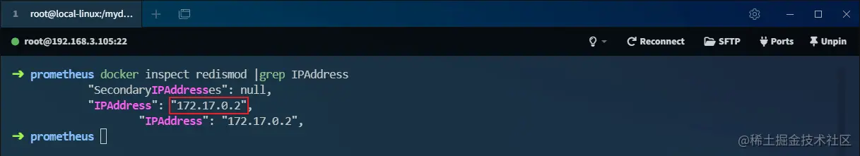 - 连接到redismod需要使用到它的容器IP地址,使用如下命令查看redismod容器的IP地址;